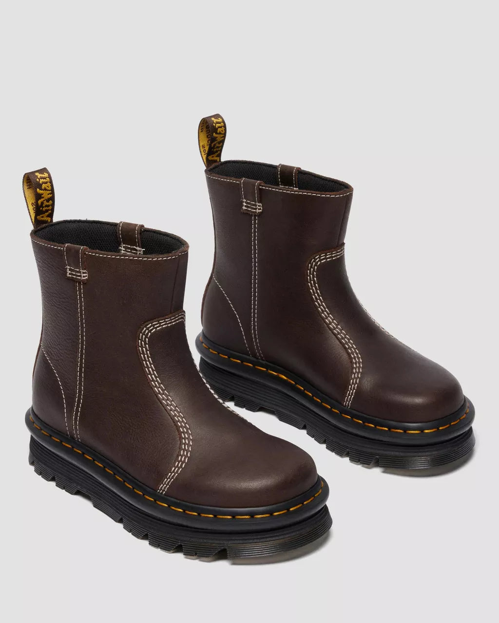 Easy comfort, easy go. Our new Zebzag Rigger boot has a silhouette inspired by industrial footwear — rebuilt for easy living and even easier styling. Made with rugged Wyoming leather with dual pull tabs on either side — so you can pull on and head out. The ergonomic Zebzag sole combines lightweight EVA and durable PVC to give your feet an easy ride without limiting your destination. And our SoftWair footbed adds extra cushioning. The sole boasts distinctive DM's signatures, with a bold tread pattern, exaggerated grooving, and our unmistakable yellow welt stitching.