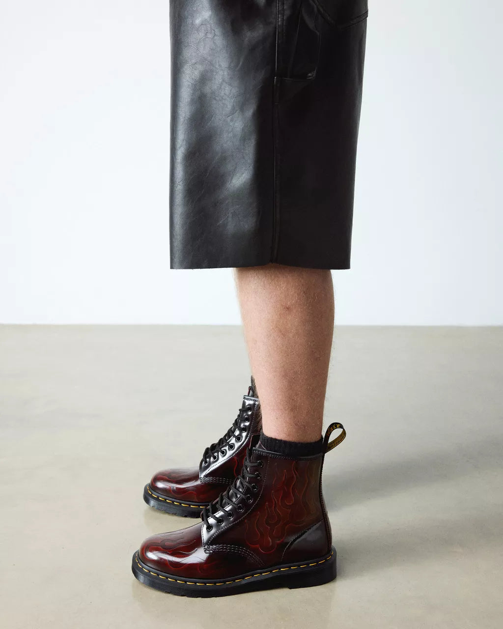 Scorched leather. Timeless design. The 1460 Inferno boot is forged with flame-etched two-tone Arcadia leather. The leather’s rub off characteristic means the color will gradually shift over time as the topcoat wears off to reveal the cherry red base color. The boot stands on our heat-sealed, air-cushioned DMS sole, marked with distinctive grooving and a yellow welt stitch. Finished with our scripted black and yellow heel loop.