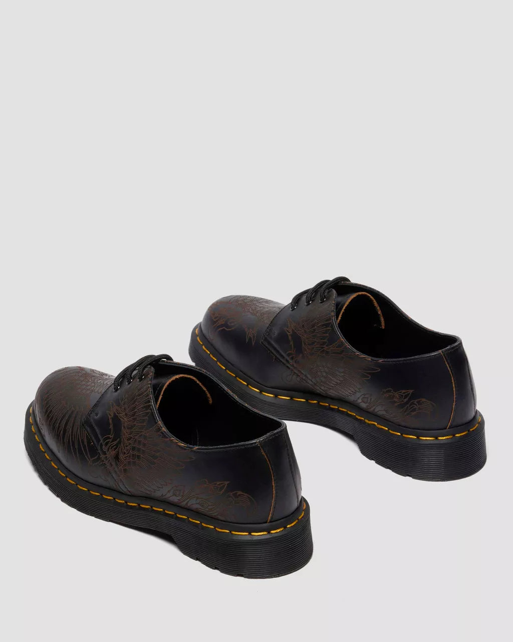 Symbolism expressed in form. The 1461 Phoenix 3-eye shoe captures the spirit of the phoenix: resilience, strength and renewal. Using the original 1461 shoe’s silhouette as a canvas, we applied black Vintage Smooth leather with a unique red print etched in. And retained classic DM’s features: a scripted heel loop, yellow welt stitching and a smoke DMS sole with classic grooving.