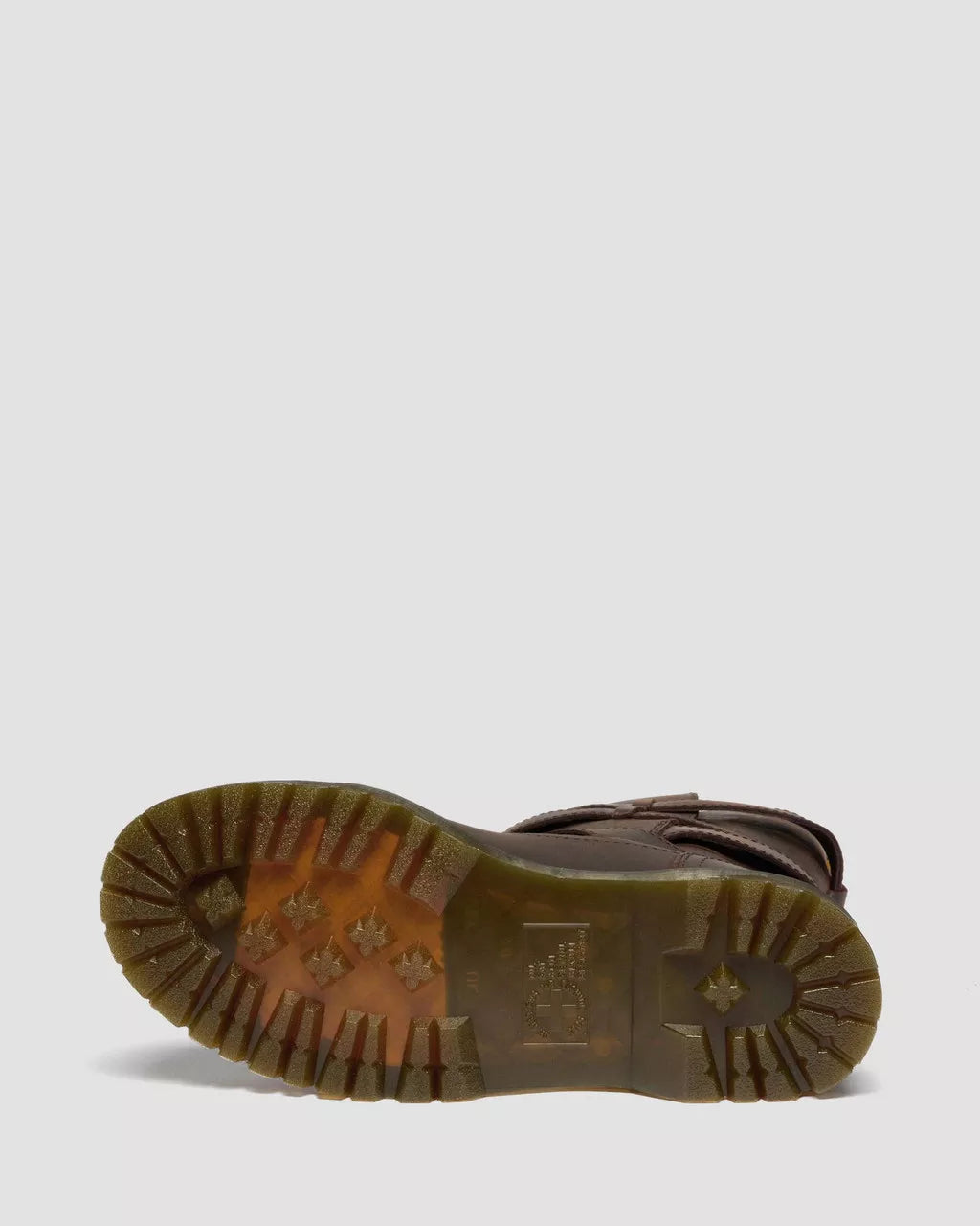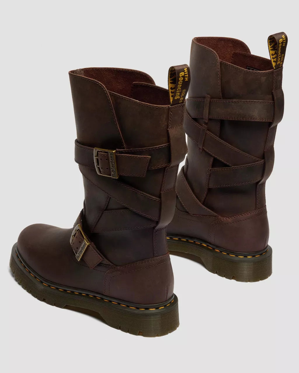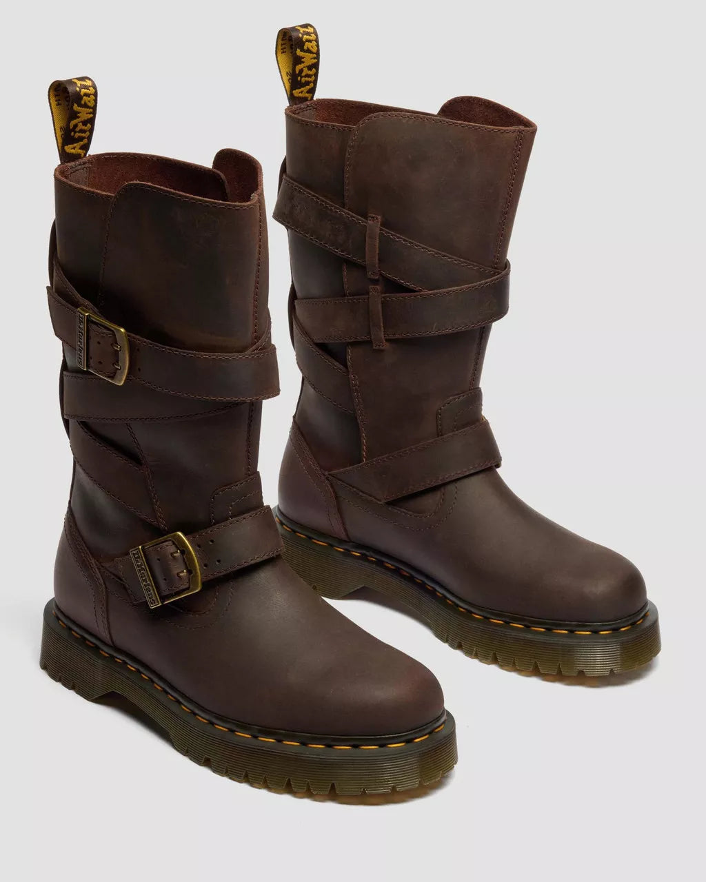 The archive-inspired Anistone boot reworks a tall silhouette with biker-inspired detailing. Built from waxy Crazy Horse leather, it’s secured with a wrap-around strap and Indian Antique Brass buckles, a nod to classic motorcycle styles. Our signature yellow welt stitch and a brown and yellow heel loop keep every detail considered. Secured with a bitter choc welt with a BEX outsole for exaggerated deep cleats and a little extra height, the Anistone is built for the long-haul.