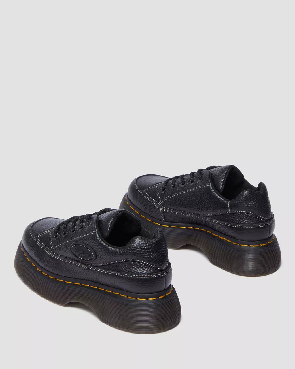 Feel the Buzz. Inspired by our 90s silhouettes, the new Buzz 5-eye shoe grabs attention from top to bottom. It stands on our chunky barrel-edge Buzz sole — marked with DM’s grooving, yellow welt stitching, and a leaf pattern on the undersole. The soft Milled Nappa leather upper has a comfortable padded collar, contrast stitch detailing, and an inflated, rubberised badge that echoes the contours of the sole.