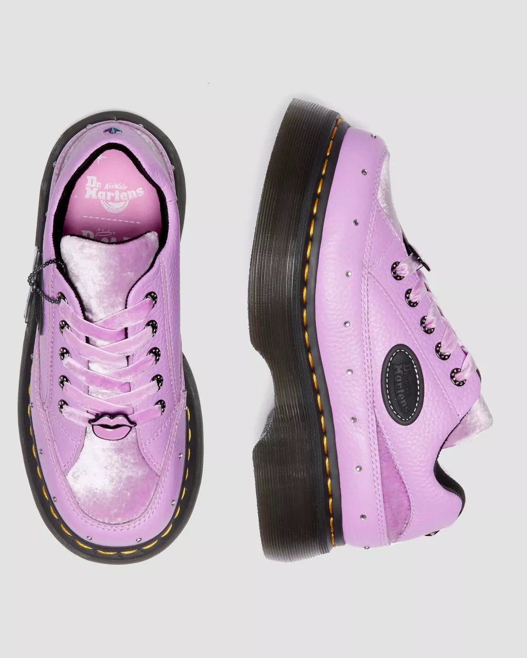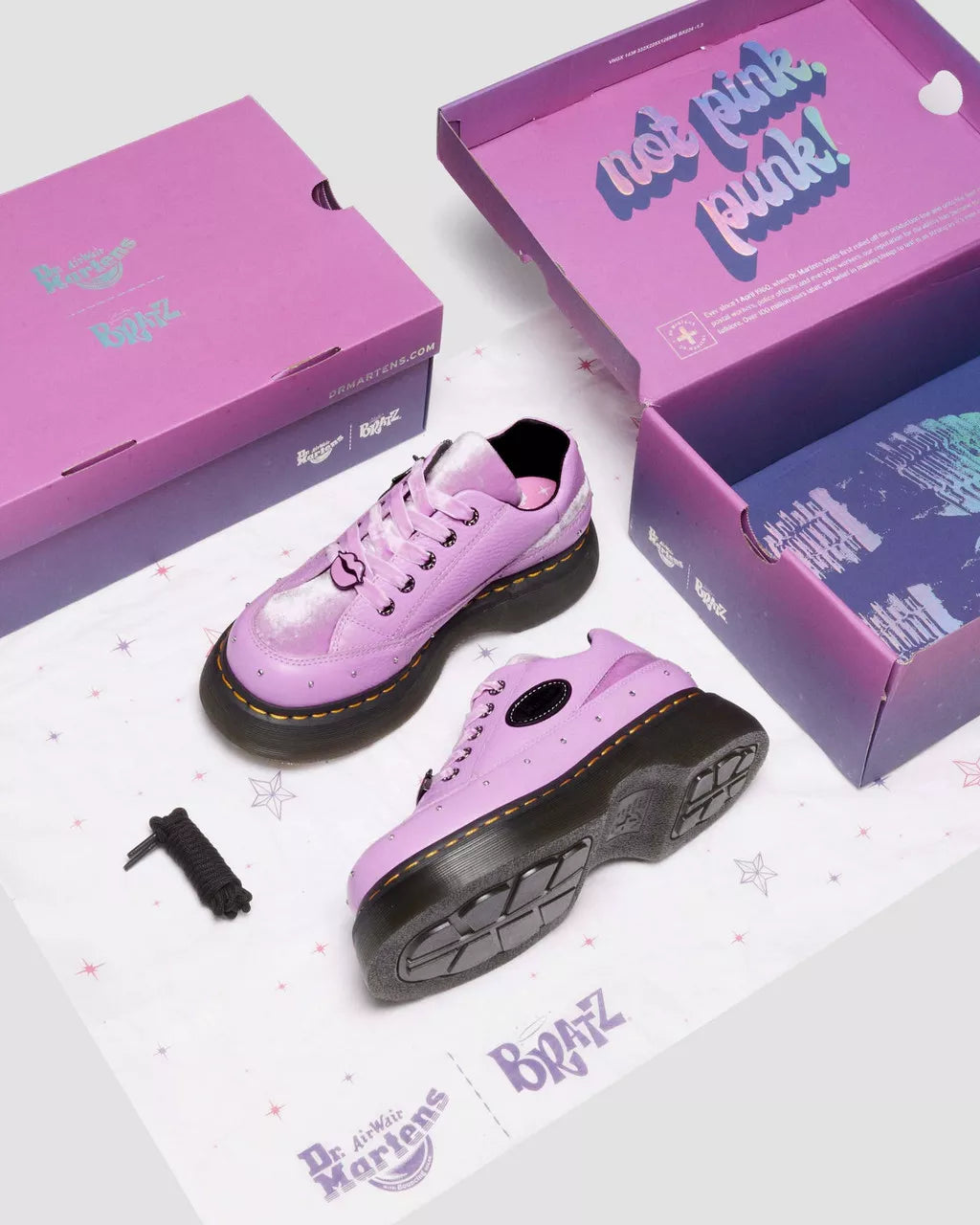 Step out of the box. We've taken our nostalgic, 90s-inspired Buzz shoe and customised it with a heavy dose of bratitude. The Bratz Buzz shoe stands on our chunky barrel-edge Buzz sole – marked with DM’s grooving, a welt stitch, and a leaf pattern on the undersole. The contrasting upper combines Milled Nappa leather and a Bratz-approved velvet panel, complete with diamante eyelets, stud details and a star studded backstrap. Lilac velvet laces and a Bratz dog tag charm add the finishing touches to this larger-than-life style. This shoe also comes with an additional pair of black cord laces.