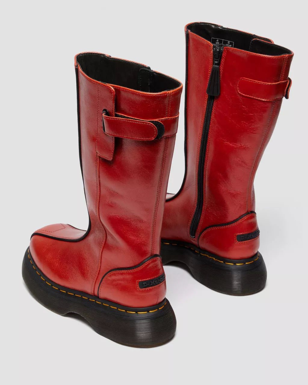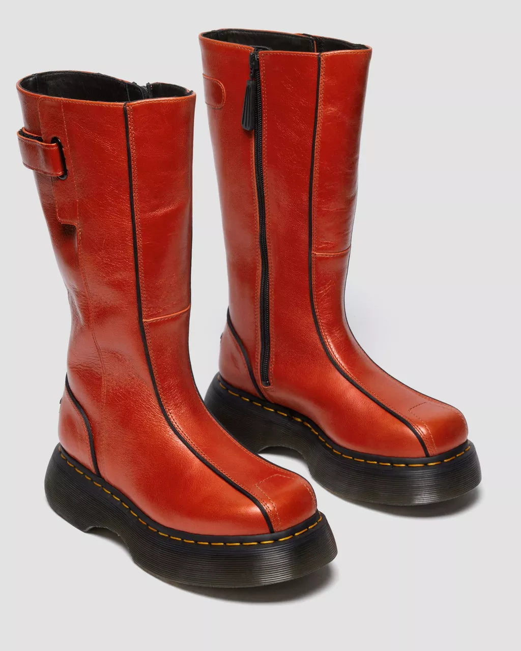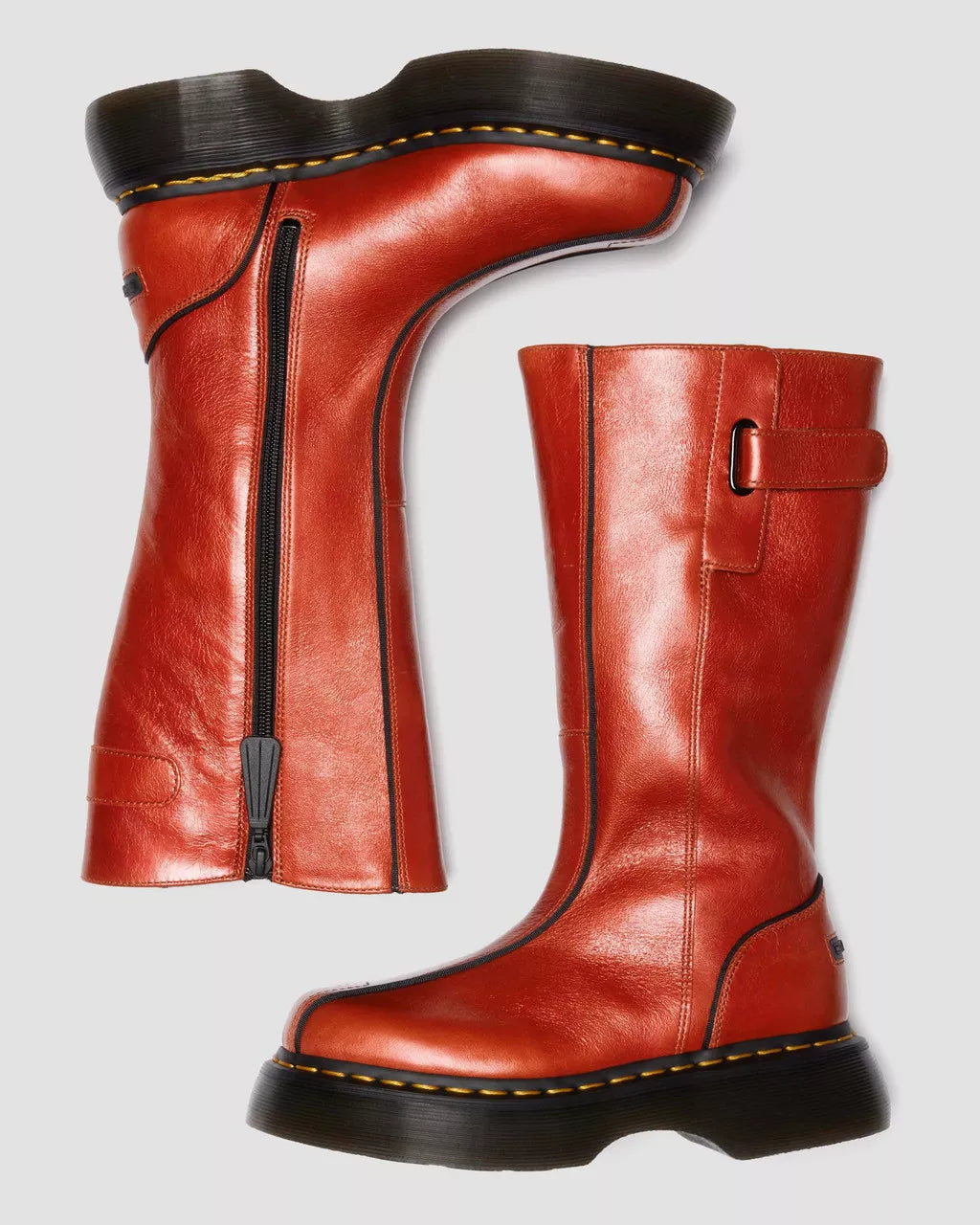 Our archive-inspired Buzz sole is back — and this time, it’s carrying a boot. The Buzz Hi boot gives a nostalgic nod to the big boot attitude of the 90s with rubberized branded patches and sport-inspired piping detail. It comes equipped with an inside zip closure and an adjustable Riptape strap. Eclipse leather gives the boot a high gloss surface to catch the eye. The platform sole that gives the boot its name is as bold as ever. With air-cushioned construction, a barrel-edge, yellow welt stitching, and our signature grooving pattern. Finished with a statement leaf undersole pattern unique to the Buzz sole.Eclipse leather is a semi-aniline smooth leather with a standout metallic appearance.