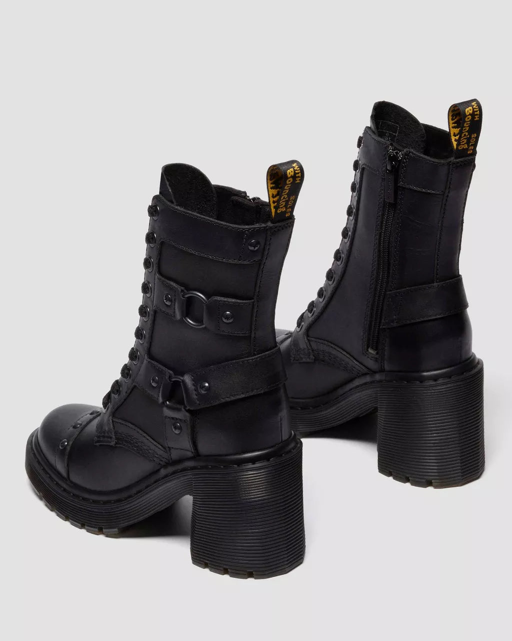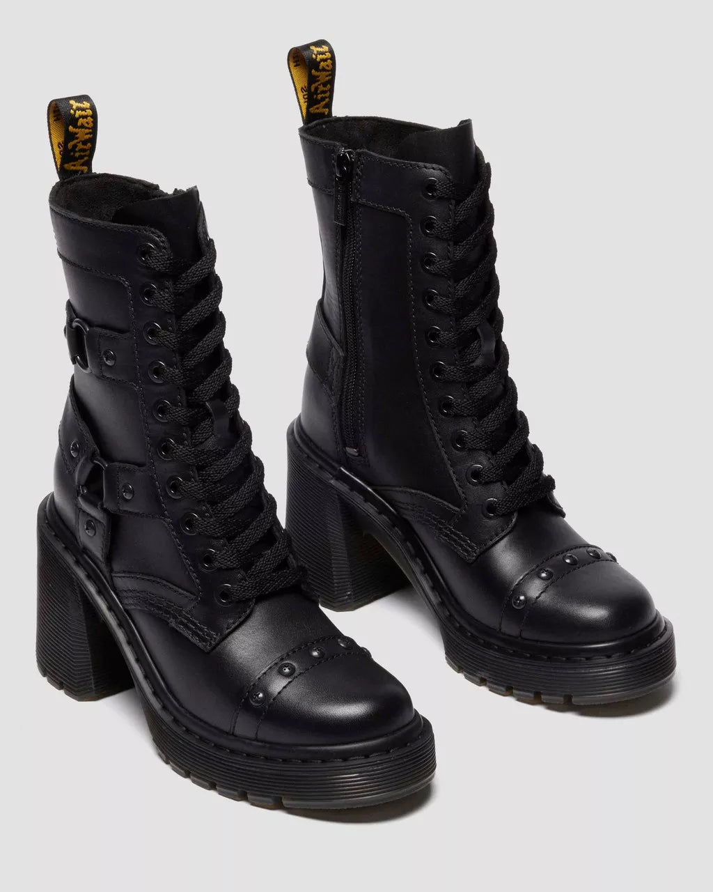 Harness your edge – at a height. The Chesney Harness 10-eye boot is reworked with a strap-led update. Soft and smooth, Sendal leather forms the foundation of the boot. Crafted to stay true to the Chesney silhouette, we accessorized it with antique black cross rivet hardware on harness detailing. With a side zip for easy fastening, our scripted heel loop sits at the top of the boot, and our signature yellow faux stitching lines the welt. The boot is finished with a black cemented Ardern sole – heeled and grooved for maximum impact with every step. This semi-Aniline, natural-look Nappa Leather features a smooth full-grain finish.