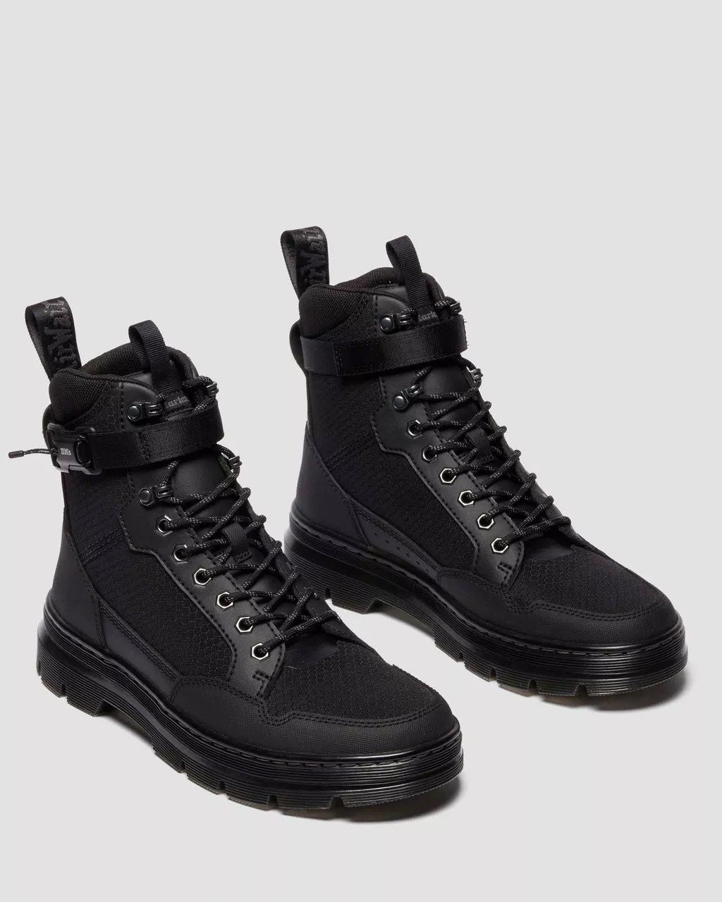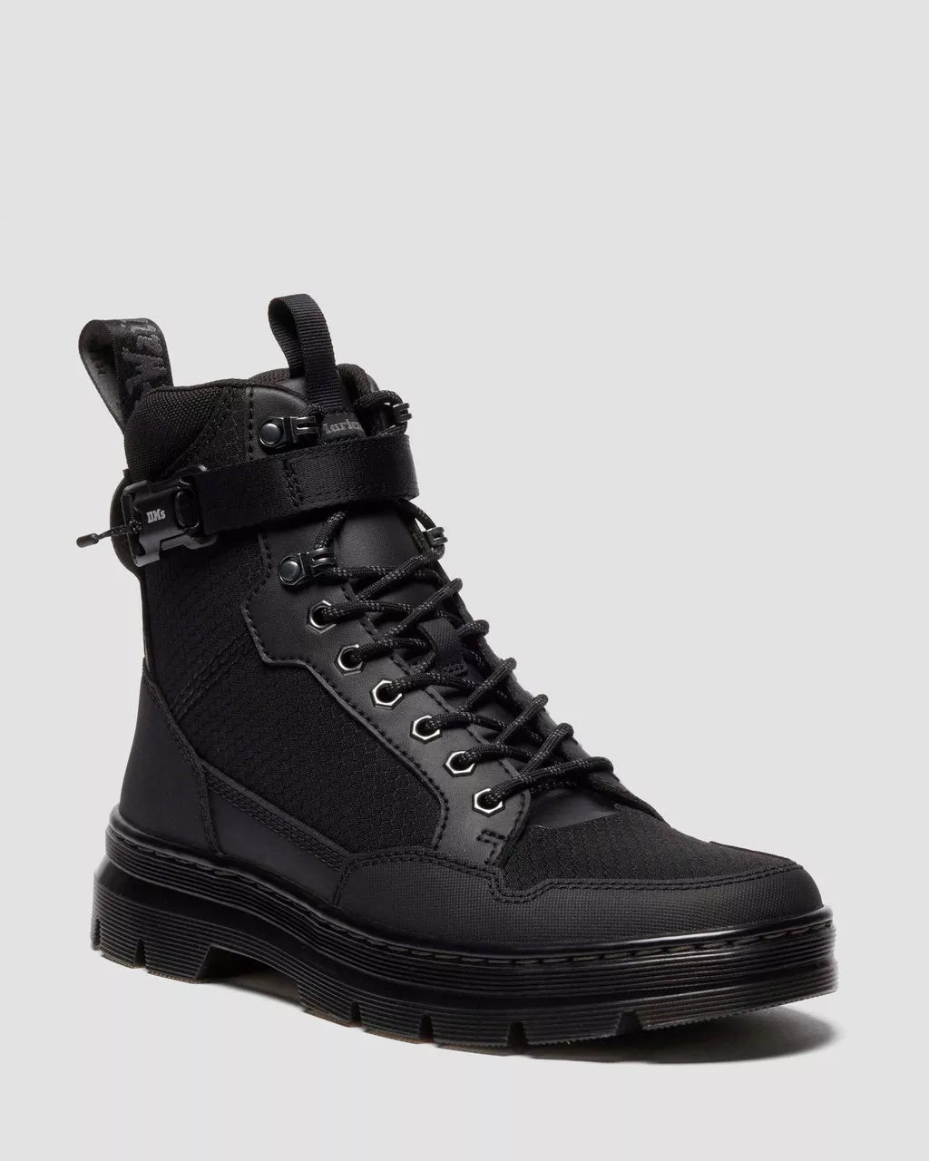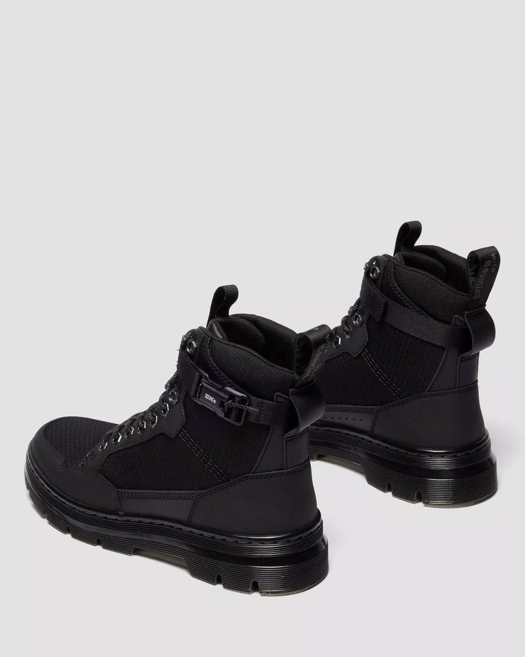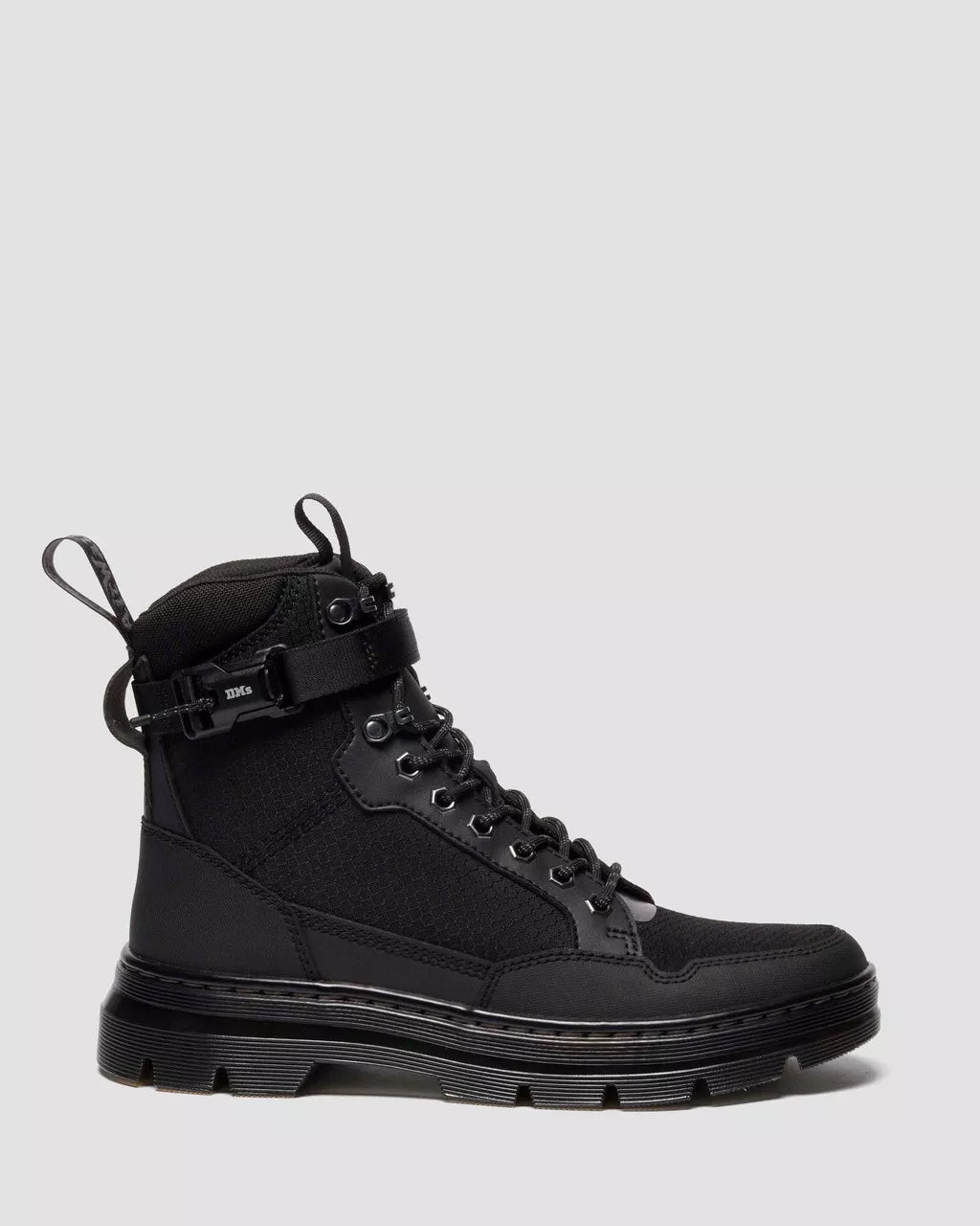 Back with a more purposeful edge. The Combs Tech MK.02 8-eye boot is re-wrapped in a dual-material upgrade. Recycled Hexagon Canvas material sits alongside Ajax, a PU-coated suede with embossing detail, along with new ski hooks and notch detailing on the quarters. This forward-thinking update doesn’t stray from the original Combs Tech boot features: functional detailing still dominates with an adjustable ankle strap and front pull tab, and hexagonal eyelets. Our black and gunmetal heel loop sits at the ankle, while black stitching and a cemented black and smoke PVC outsole gives the boot a tough but lightweight finish.