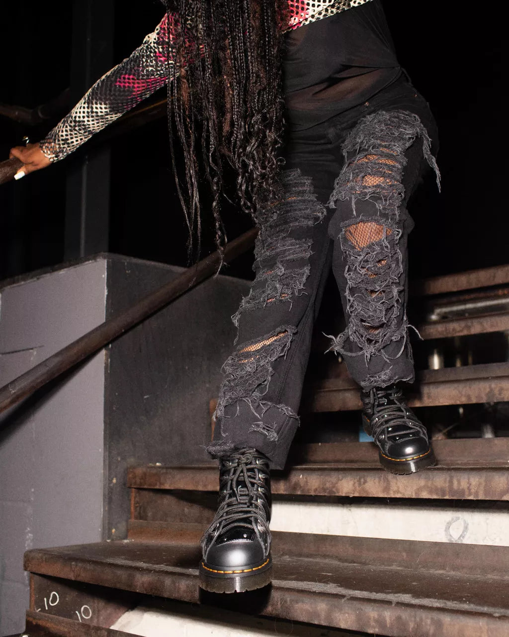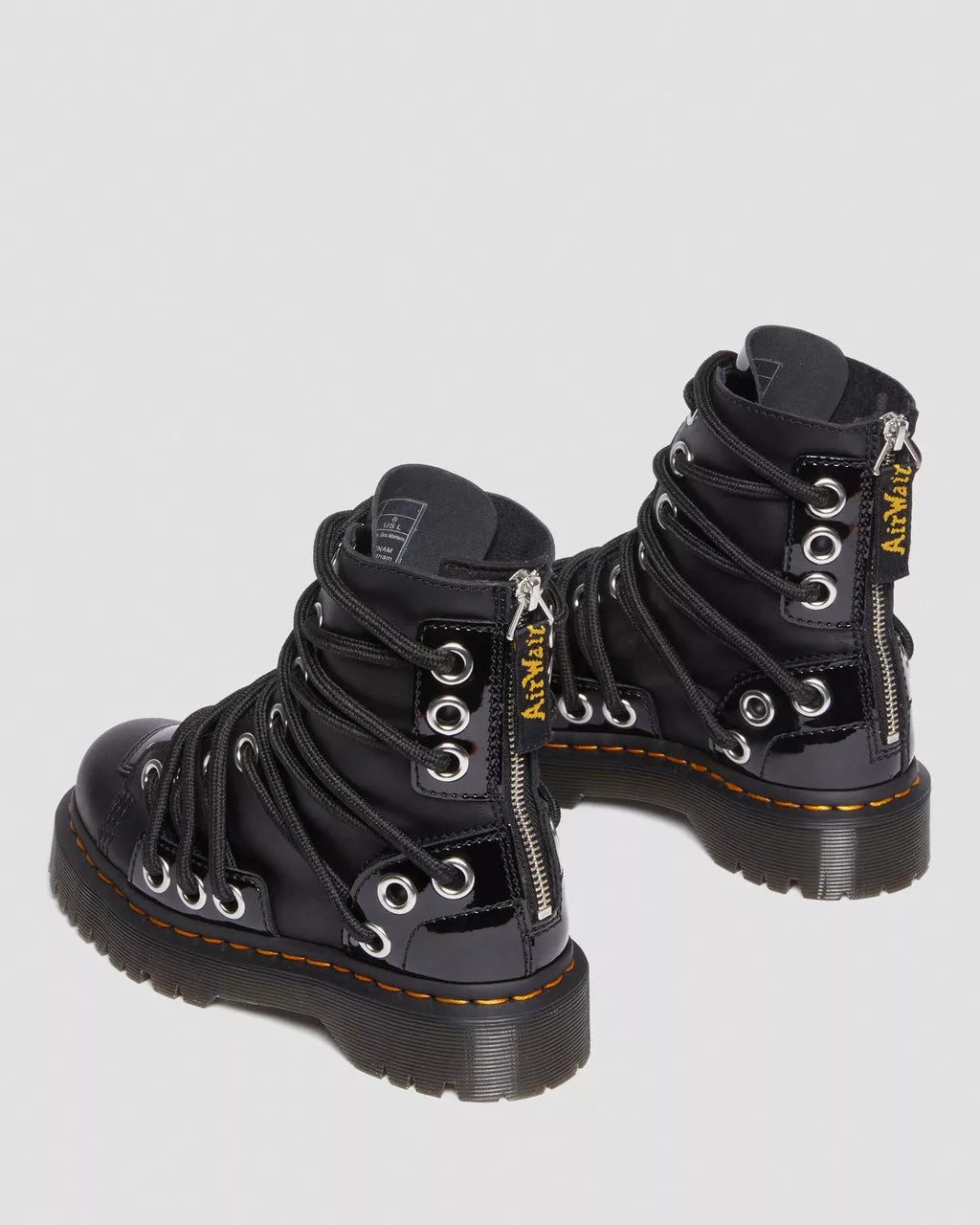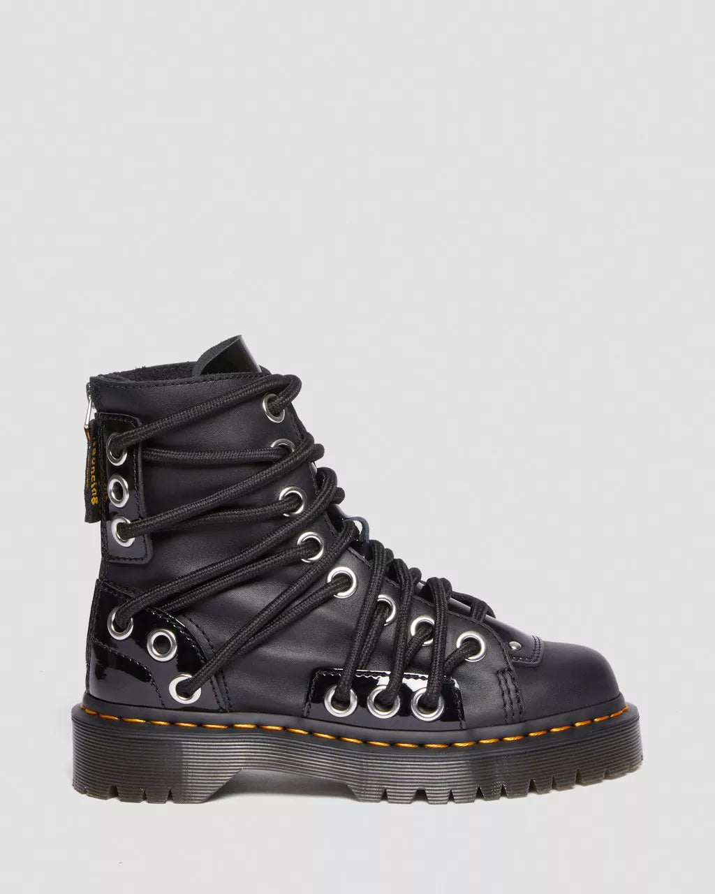 We've always been inspired by the new and unconventional ways our community have found to fasten their DM's. This new boot is a tribute to their modifications and creations. The Daria Bex is fitted with a newly designed lacing system: with extra thick cord laces and silver eyelets scattered across the uppers. The boot fuses Lucido and Patent Lamper leather for added impact and is stacked on our 1 5/8 inch Bex outsole for a truly unmissable footprint. The 8-eye silhouette is fitted with a silver back zip with an AirWair heel pull for easy on-off wear and is finished with our signature yellow welt stitching.