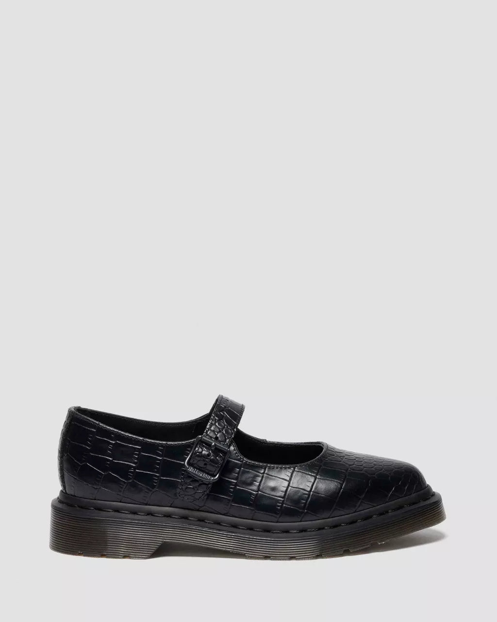 Less dainty. More Doc’s. Buckle up our pointed Elphie Mary Jane shoe — now dressed in statement croc-embossed Atlas leather for monochromatic texture. Fastened with a single strap with an adjustable DM’s branded buckle to lock in your perfect fit. The tapered sole is marked with DM’s signature grooving and secured with tonal black welt stitching.