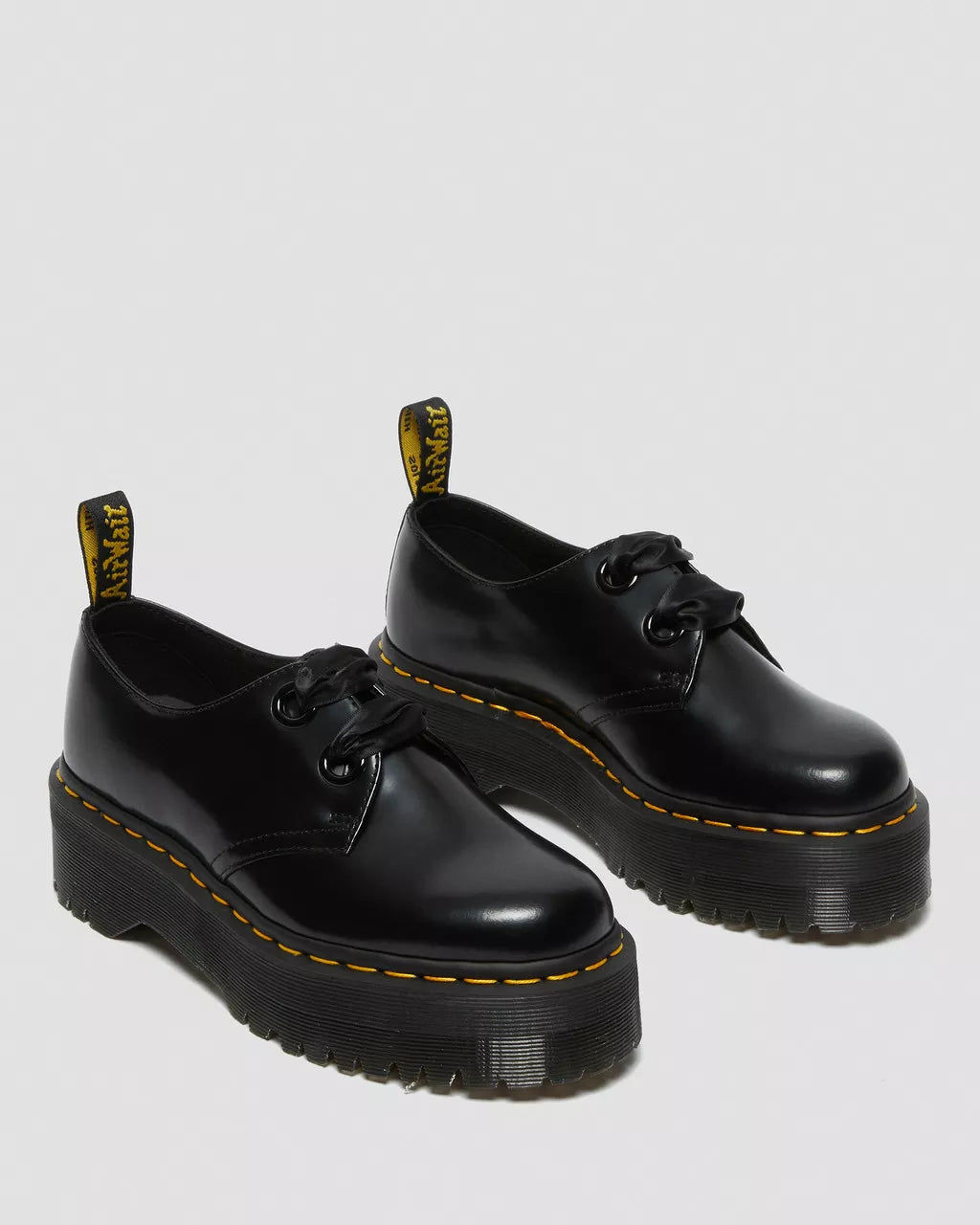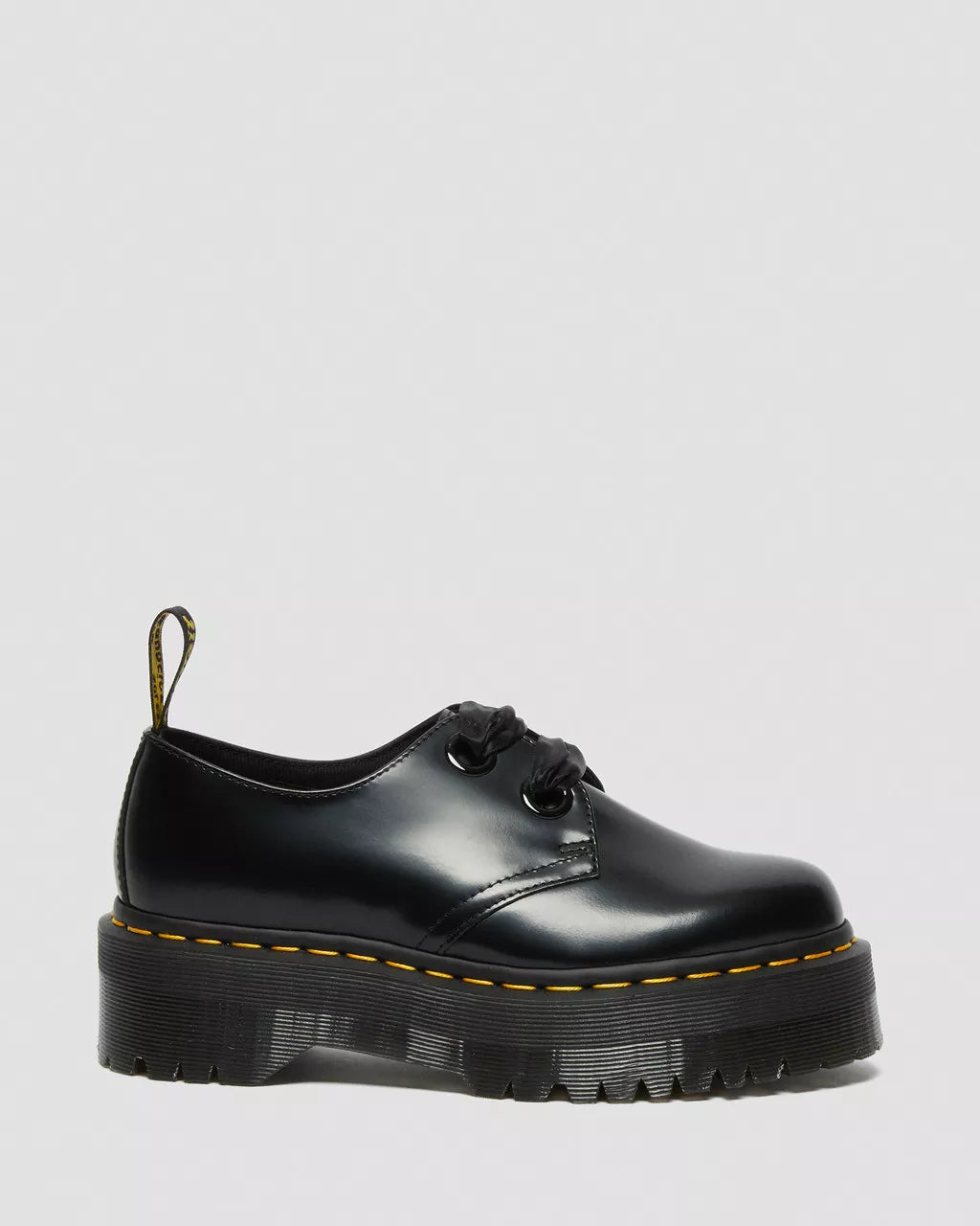 Our Molly boot kicked up a storm last year, so we manufactured it a partner in crime. The Holly shoe is its 2-eye little sister, kitted out with the same Quad retro sole, matching satin laces and big, bold eyelets. On a towering 1 1/2 inch platform sole, it's made for people who aren't afraid to stand out. Comes with two pairs of laces, including a satin ribbon lace.