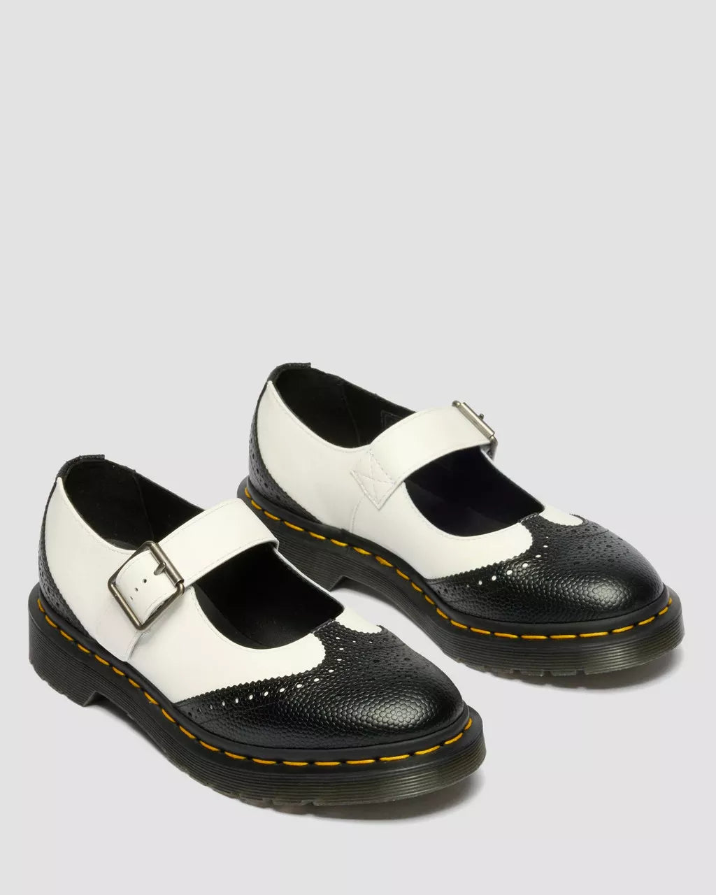 The Mary Jane shoe steps out in bold monochrome. Contrasting Atlas Pebble Grain and Smooth leathers set the stage, while brogue trim detailing punctuates the upper. Finished with antique silver hardware and grounded on our iconic yellow welt stitching and durable air cushioned sole. This silhouette is equal parts timeless and tough.